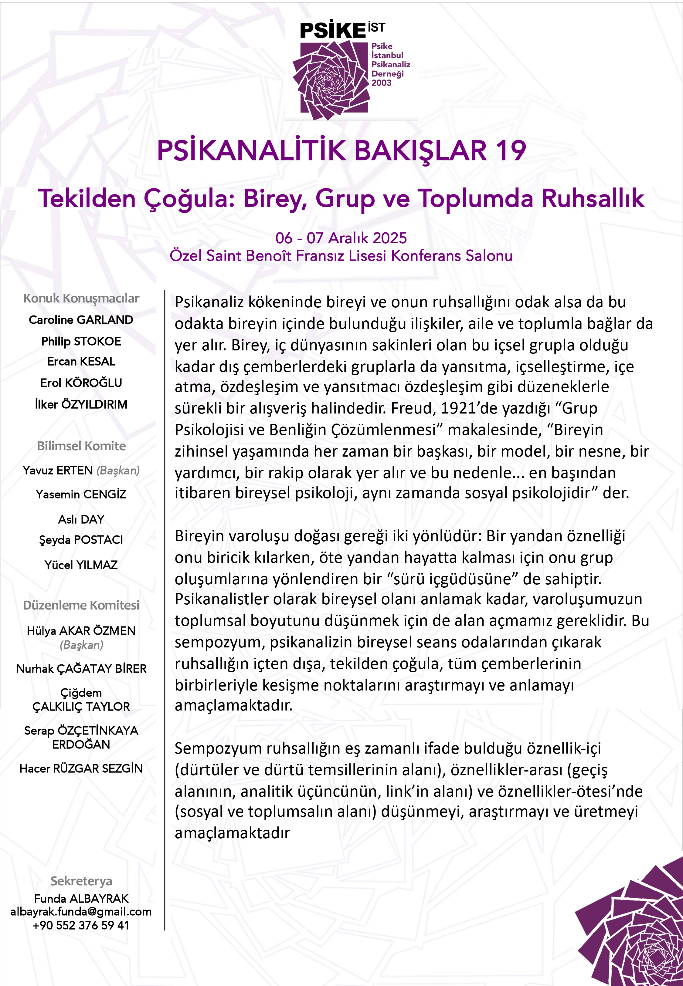 | 14.15 – 15.30 | PANEL İnanç, Kimlik, Ruhsallık; Bireyden Topluma Psikanalitik Bir İzlek Paneli Moderatör: Ayla YAZICI |